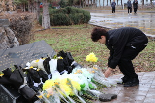 他的军事才能如璀璨星辰,照亮战略部署的天空;创新精神如破晓的曙光,不断引领兵团迈向更加灵活高效的戍边方略。张仲翰将军的爱国心声随着边疆的风传唱,他的足迹在历史的长河中留下深深的印迹。他那高尚的爱国精神和戍边功绩,成为一代又一代守边人的楷模与传奇,永远激励着我们坚守岗位,护我河山。1963年,张仲瀚在第一届学生毕业典礼上说:“希望我们兵团农学院出去的同学,都能当常胜军,都能搞丰产,要使我们兵团农学院的牌子响亮起来!”迎着初生的朝阳,全体成员向英烈敬献鲜花手中的鲜花,象征着我们对烈士们的崇敬和怀念。愿这些鲜花能够陪伴烈士们安息,也愿他们的精神永远激励我们前行。