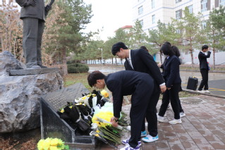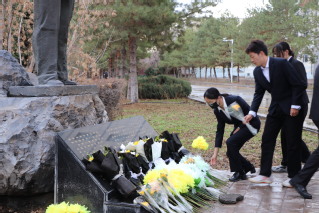 献花完毕,全体同学们肃立向张仲翰将军的塑像三鞠躬,表达自己的钦佩。随后,是长达三分钟的无声默哀,愿将军的精神如春日里的风,吹拂在每一位后来者的心头;愿将军的故事如清泉般的水,滋润我们坚守理想、勇于担当的决心。