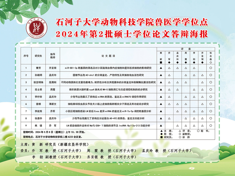 石河子大学动物科技学院兽医学学位点2024年第二批硕士学位论文答辩海报