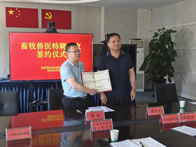 期间,克拉玛依区农业农村局局长宋海涛为学院蒋松副教授颁发“畜牧兽医特聘专家”聘书。并表示希望通过此次聘任,进一步加强与石河子大学动物科技学院的合作,共同推动区域畜牧业的发展。同时蒋松副教授发言将充分发挥自己的专业特长,积极参与克拉玛依区畜牧兽医技术推广和科技服务工作,为地方畜牧业的发展贡献力量。