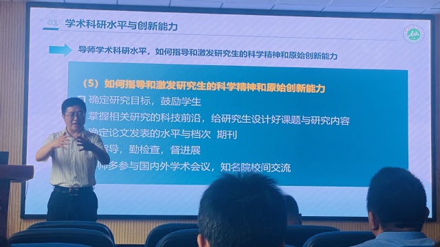 胡昌娃书记做了题为《涵养高尚师德,潜心立德树人》的报告,对导师职业道德规范进行了培训。张辉院长从《科研能力与研究生指导》方面,做了关于导师如何提升学术科研水平和研究生指导能力,如何指导和激发研究生的科学精神和原始创新能力,培养出优秀研究生的报告,进行了导师胜任力提升培训。赵宗胜副院长则从研究生教育政策解读研究生培养工作,领学全国研究生教育会议精神及《学位法》,解读学位与研究生教育政策法规、制度规定等。