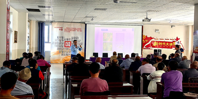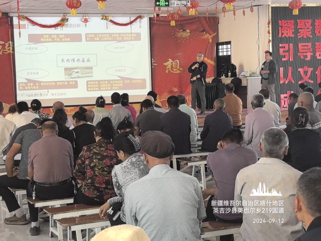 2024 年 9 月 11 -12日,石河子大学动物科技学院孙新文教授带领齐亚银、刘良波2名教授赴喀什地区英吉沙县,为当地村民开展了棉花秸秆微贮饲料化利用技术推广服务工作。英吉沙县人大常委会主任,县畜牧兽医局主要领导亲临现场,在克孜勒乡前进村(17村)、也尔乡荒地村(10村)、色提力乡诺贝希比纳木村等3个示范村为300余村民进行了技术培训和资料发放。