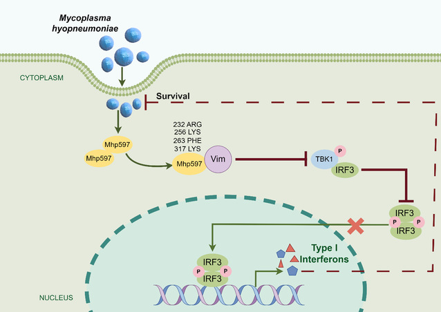 M. hyopneumoniae感染引发猪慢性传染性肺炎,对养猪业造成重大经济损失。本研究发现M. hyopneumoniae核酸酶Mhp597作为潜在效应子调控宿主I型干扰素(IFN-αand IFN-β)的产生,进而在M. hyopneumoniae免疫逃逸中发挥作用。研究发现Mhp597在宿主细胞中具有高效的表达能力,并能显著抑制IFN-α和IFN-β表达,同时降低TBK1和IRF3的磷酸化水平。通过酵母双杂交和免疫共沉淀实验发现Mhp597通过特定的氨基酸残基(ARG232、LYS256、PHE263和LYS317)与猪肺泡巨噬细胞Vimentin(Vim)相互作用。进一步分析表明,Mhp597可通过Vim抑制TBK1和IRF3的磷酸化,进而抑制I型干扰素的产生,促进M. hyopneumoniae在宿主细胞内繁殖。总之,本研究首次阐述了Mhp597通过Vim负向调控TBK1-IRF3-IFN-I信号通路促进M. hyopneumoniae在宿主细胞内的免疫逃逸和增殖的分子机制,这些发现增进了我们对M. hyopneumoniae致病机制新的理解,为开发新的治疗策略提供了潜在的分子靶标。