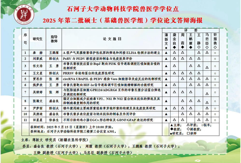 石河子大学动物科技学院兽医学学位点2025 年第二批硕士(基础兽医学组)学位论文答辩海报
