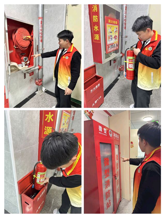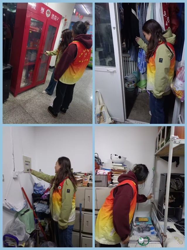 活动中,宣讲团首先结合典型火灾案例,向同学们详细讲解了火灾成因、初起扑救要点以及逃生自救方法,重点强调了违规用电、杂物堆积等常见安全隐患。随后,在李优嘉老师的带领下,宣讲团成员前往北苑新区七号楼男生宿舍与北区三号楼南段女生宿舍,针对“阳台堆放杂物”“移动插线板未固定上墙”“宿舍无人时未切断电源”等问题开展了专项排查。检查过程中,成员现场督促整改,并提醒同学们务必规范用电、严禁使用违规电器,从源头上杜绝火灾风险。