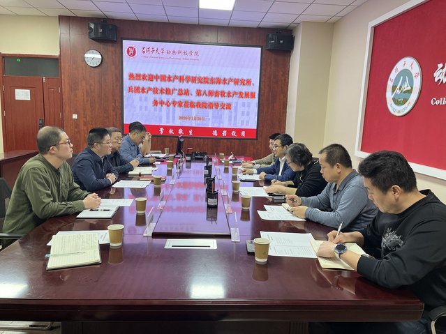 2026年1月30日,中国水产科学研究院东海水产研究所副所长赵峰研究员、海水养殖生态与技术研究室主任来琦芳研究员、李一鸣副研究员,以及新疆生产建设兵团水产技术推广总站艾涛高级工程师、第八师畜牧水产发展服务中心茅渊科长一行,莅临石河子大学动物科技学院进行交流访问。学院院长张辉教授、副院长赵宗胜教授及刘涵、孙志华、张石磊、李曼曼等多位副教授共同参与了座谈。